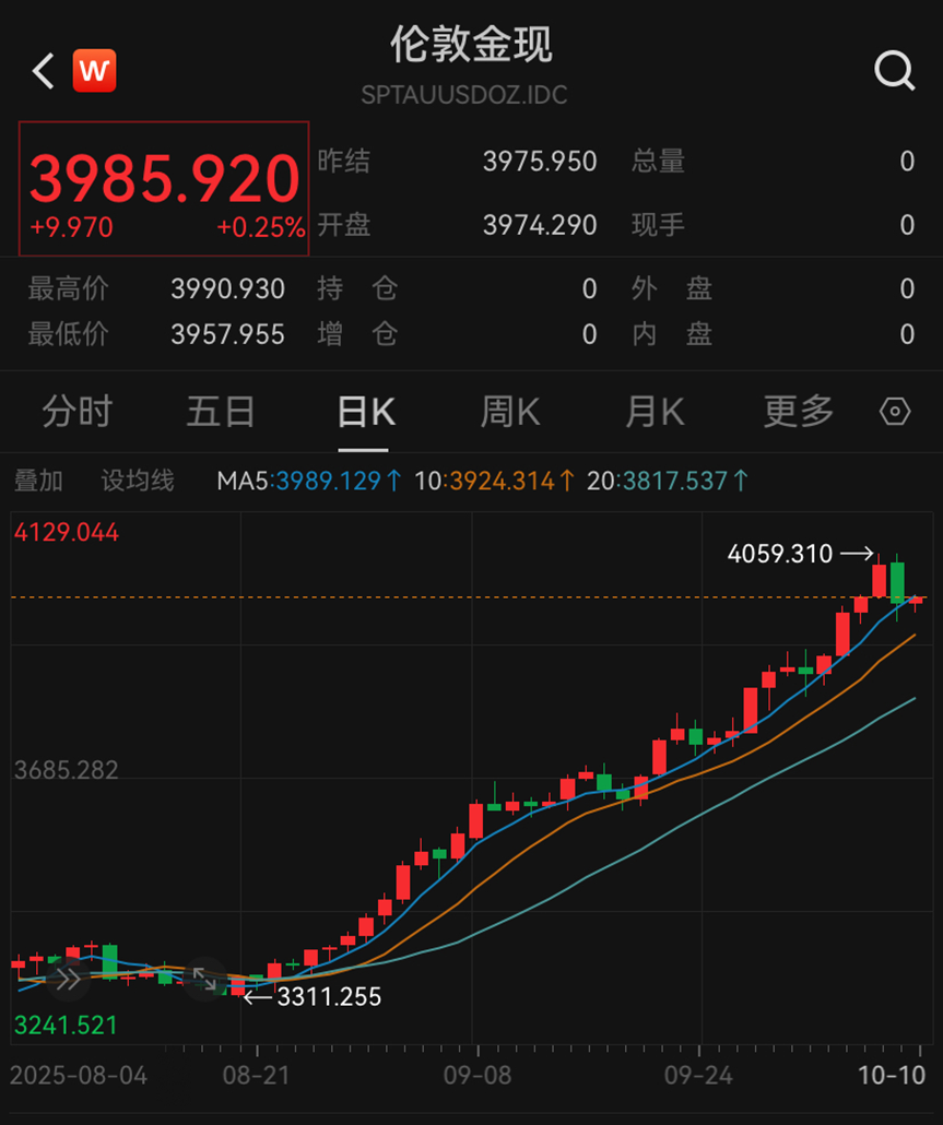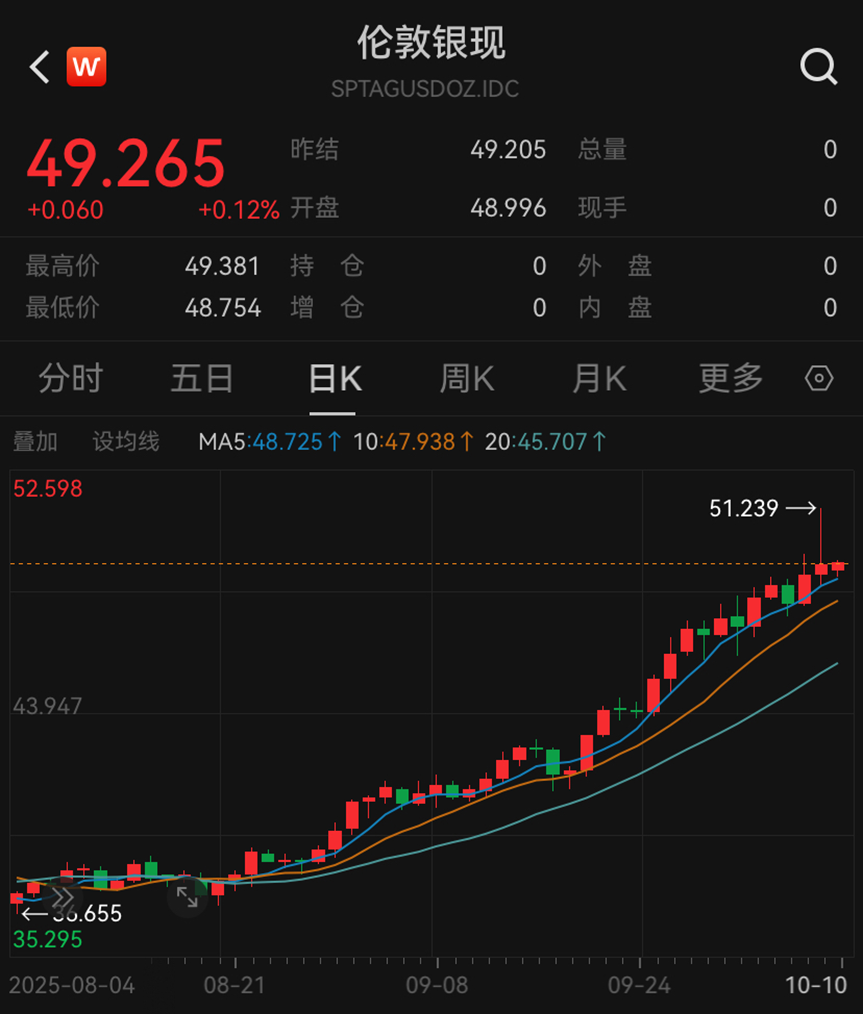 截至发稿,现货黄金价格报3985.92美元/盎司,现货白银价格报49.265美元/盎司。截至10月9日收盘,COMEX黄金期货收跌1.95%,报3991.1美元/盎司;COMEX白银期货收跌2.73%,报47.655美元/盎司。