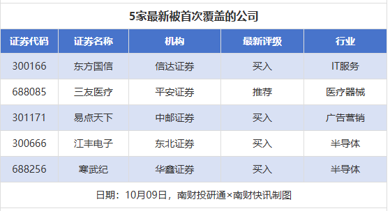 首次覆盖方面,10月9日券商共给出了5次首次覆盖,其中东方国信获得信达证券给予“买入”评级,三友医疗获得平安证券给予“推荐”评级,易点天下获得中邮证券给予“买入”评级,江丰电子获得东北证券给予“买入”评级,寒武纪获得华鑫证券给予“买入”评级。