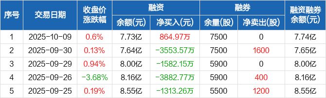 融资方面,当日融资买入9937.32万元,融资偿还9072.35万元,融资净买入864.97万元。融券方面,融券卖出0股,融券偿还0股,融券余量7500股,融券余额68.31万元。融资融券余额合计7.74亿元。