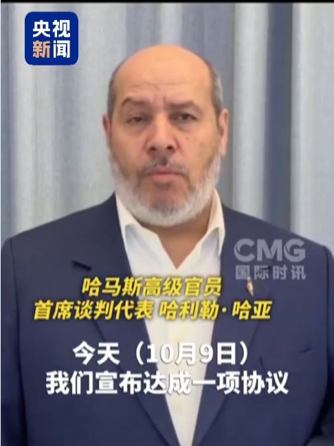 据央视新闻10月10日消息,当地时间10月9日晚,哈马斯高级官员、首席谈判代表哈利勒·哈亚发表声明宣布达成停火协议。这是各方证实加沙停火第一阶段协议达成以来,哈马斯谈判代表团首次公开发声。哈利勒·哈亚表示,哈马斯已从包括美国在内的调解方那里获得了保证,“加沙战争已经结束”。