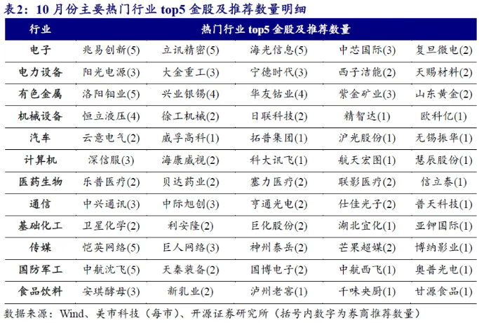 开源证券研报统计结果也显示,10月券商金股权重最靠前的行业为电子,且占比高达15.4%;电力设备紧随其后,占比为10.2%;有色金属、机械设备位居其次,占比分别为8.9%、6.3%。