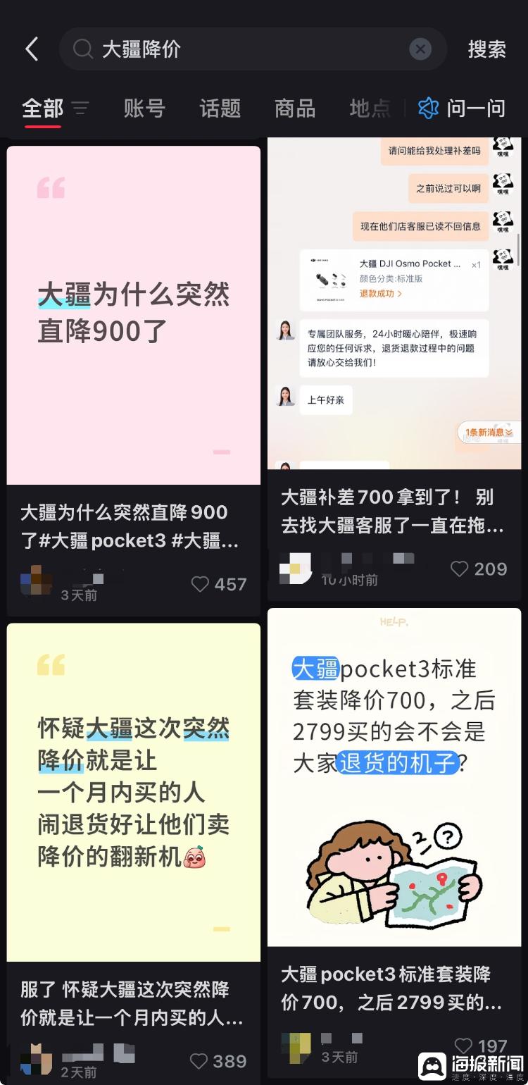 这一突如其来的调价,让刚在国庆假期前购机的消费者措手不及,并迅速引发集体维权,“大疆预告降价已购买消费者退货维权”冲上微博热搜,小红书平台涌现数千条投诉帖,已形成集中话题,黑猫投诉平台也涌现出数百条投诉记录。