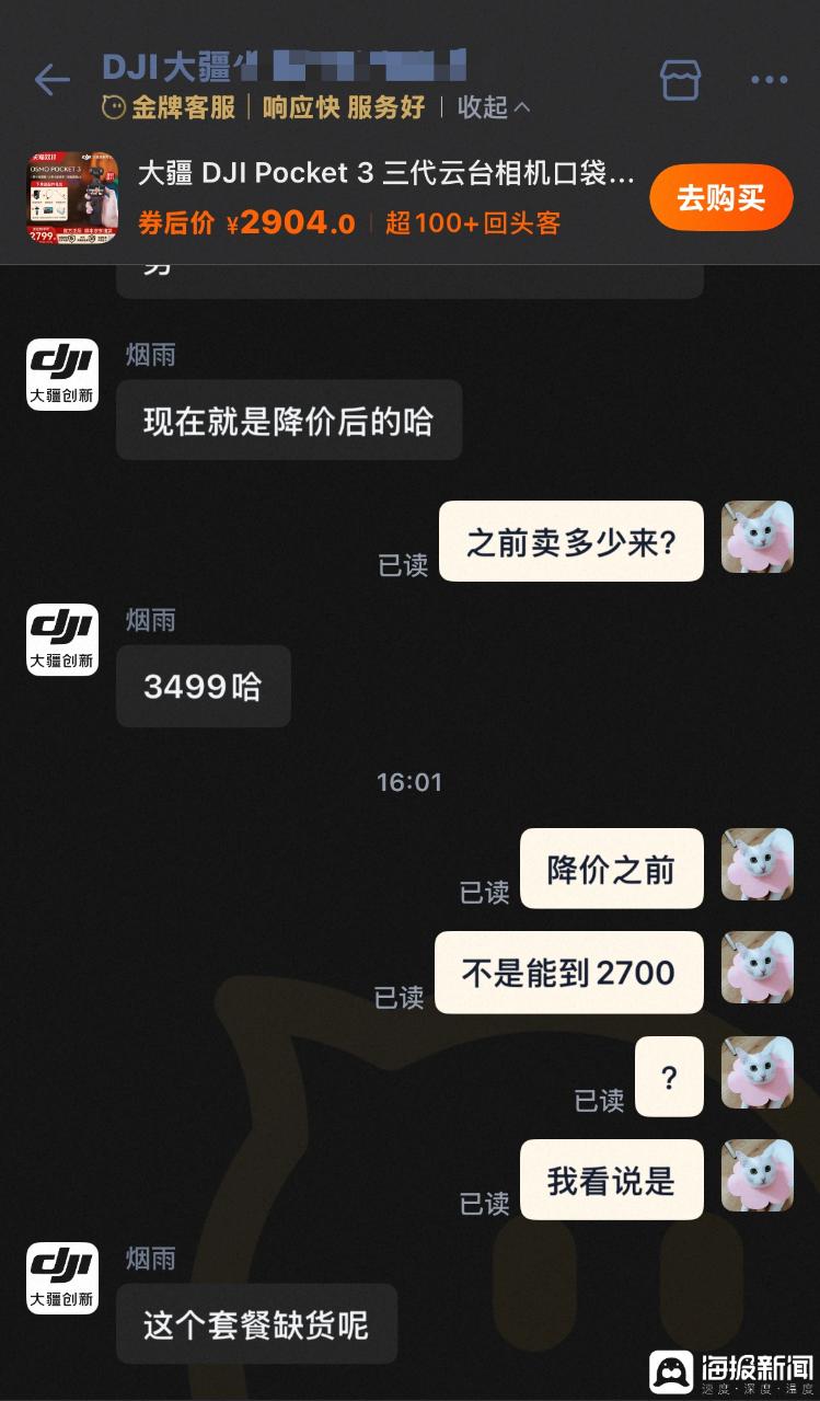 记者随机咨询淘宝一家大疆专卖店,客服表示,降价后售价2799元的Pocket 3标准版目前缺货,到货时间未知