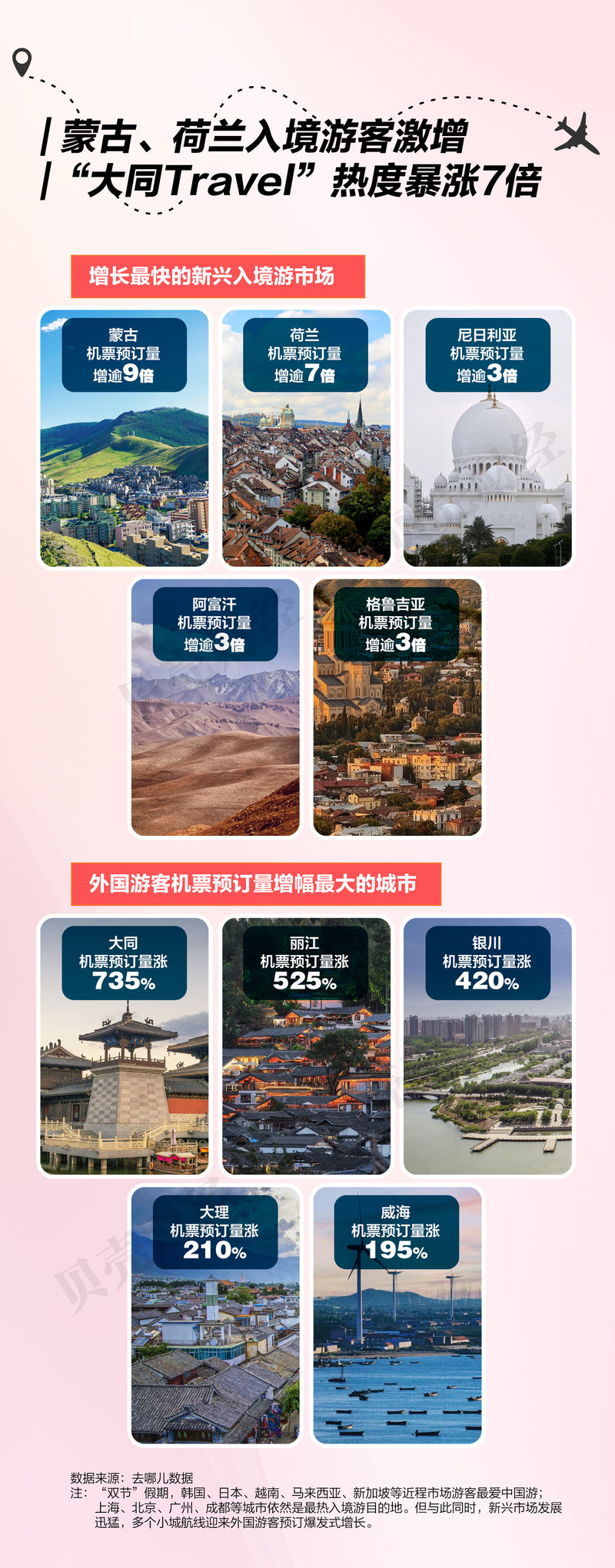 去哪儿数据也显示,今年国庆中秋长假期间,使用非中国护照预订国内航班的机票量同比增长33%,多个小城航线迎来外国游客预订爆发式增长。其中,山西大同拔得头筹,外国游客预订量增超7倍,丽江增超5倍。
