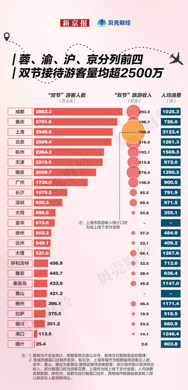 根据各地公开披露的旅游数据,新京报贝壳财经记者制作了主要热门城市的“双节”成绩单。其中,成都、重庆、上海、北京分列前四,接待游客量均超2500万人次。