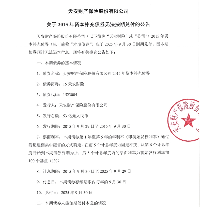 具体来看,天安财产保险股份有限公司发布公告称,其发行的资本补充债券“15天安财险”应于2025年9月30日到期兑付。据《天安财产保险股份有限公司2015年资本补充债券发行公告》,公司只有在确保偿还本息后偿付能力充足率不低于100%,且有能力清偿其他负债的本金和利息的前提下才能偿付本期债券本息。