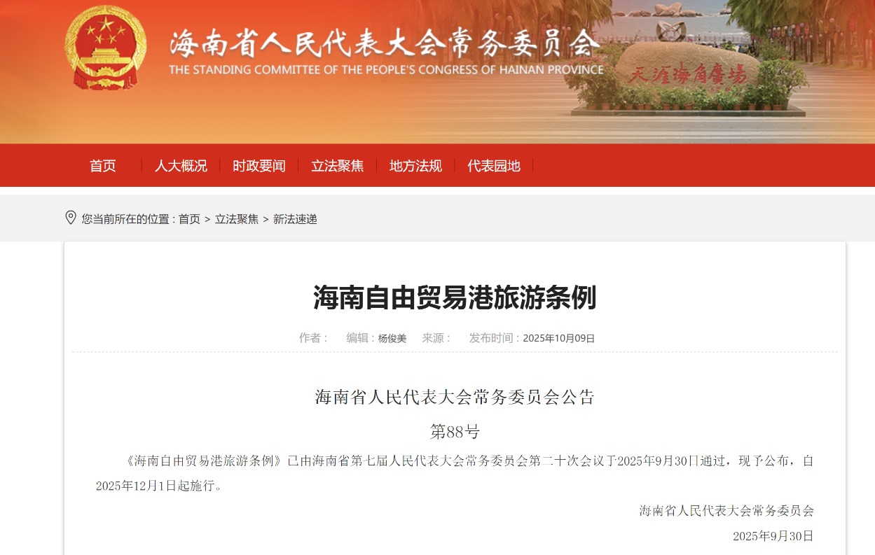 10月10日,据海南省人民代表大会常务委员会官网消息,《海南自由贸易港旅游条例》(简称《条例》)已由海南省第七届人民代表大会常务委员会第二十次会议于2025年9月30日通过,自2025年12月1日起施行。