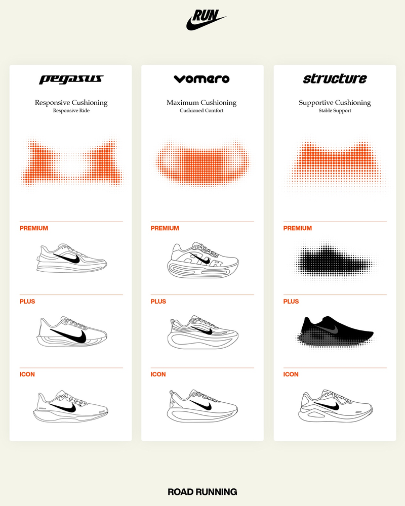 在当前全球运动用品行业聚焦争夺的跑步市场,Nike发布了全新的Vomero Premium顶级迈柔与Vomero Plus超级迈柔路跑鞋,缓震性能与舒适度得到提升,得到了跑者的广泛好评。同时,随着Vomero和Structure系列产品的更新,耐克全新简化后的路跑鞋产品矩阵大部分已正式亮相,以缓震体验为核心,覆盖多样化跑步需求。这一矩阵重塑不仅强化了耐克在路跑领域的核心优势,也为品牌的复苏注入持续动能。