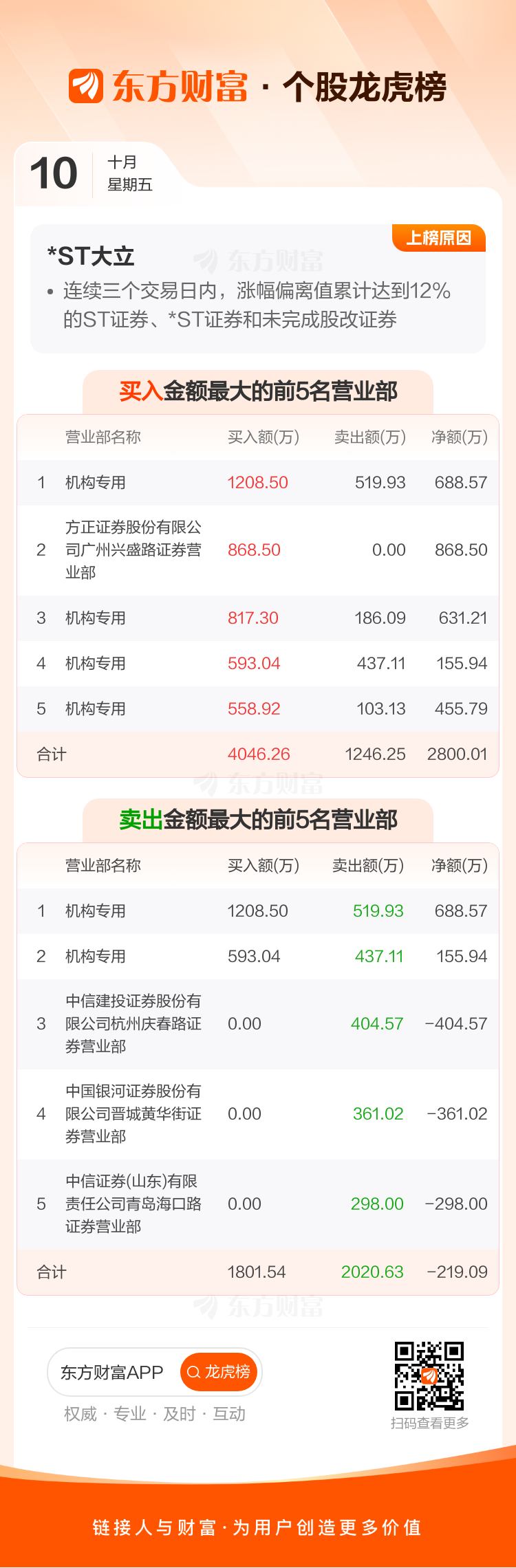 交易所2025年10月10日公布的交易公开信息显示,*ST大立因成为连续三个交易日内,涨幅偏离值累计达到12%的ST证券、*ST证券和未完成股改证券上榜。*ST大立当日收报12.57元,涨跌幅5.01%,换手率0.80%,成交额4779.42万。异常期间9月30日至10月10日,期间涨幅13.14%,累计偏离值13.25%,区间成交额1.80亿。