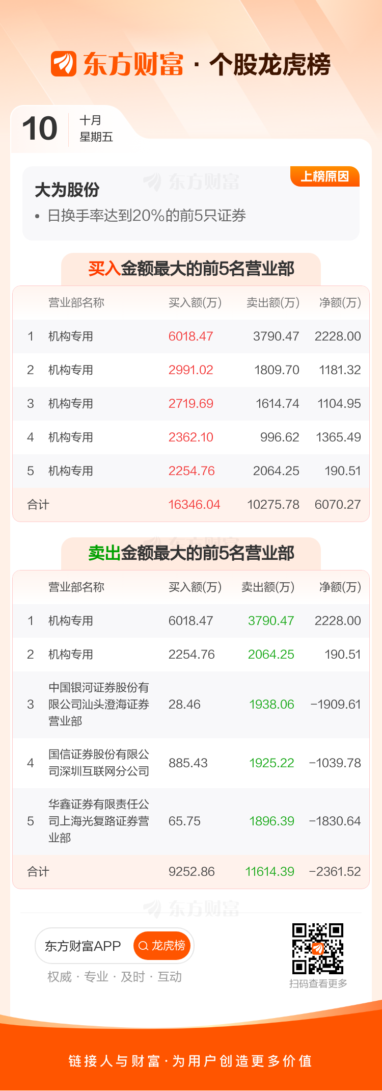 交易所2025年10月10日公布的交易公开信息显示,大为股份因成为日换手率达到20%的前5只证券上榜。大为股份当日收报21.51元,涨跌幅-0.78%,偏离值35.26%,换手率35.25%,成交额16.18亿。
