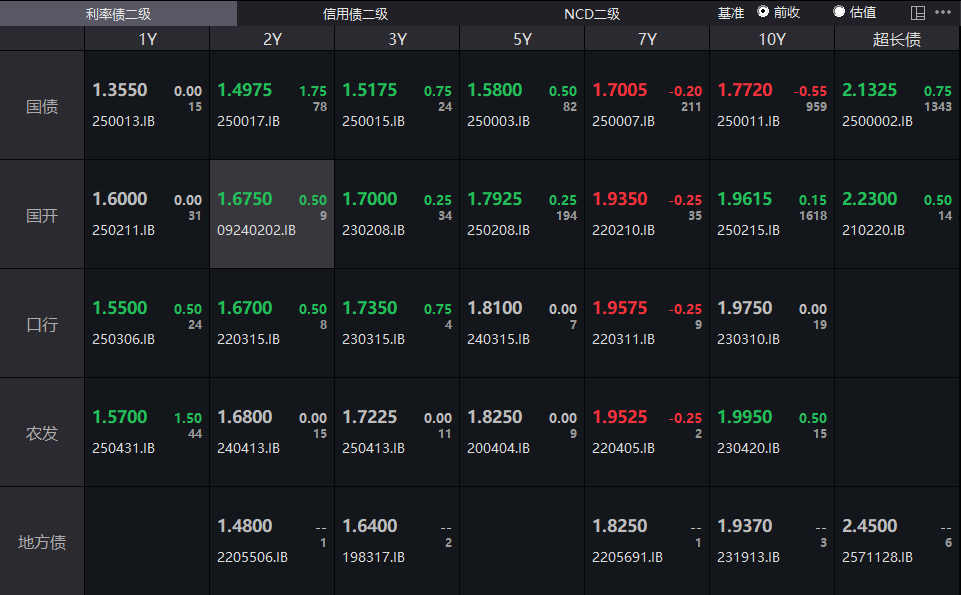 银行间主要利率债收益率涨跌不一,截至下午16:30,10年期国债活跃券250011收益率下行0.55bp报1.772%,30年期国债活跃券2500002收益率上行0.75bp报2.1325%,10年期国开活跃券250215收益率上行0.15bp报1.9615%。