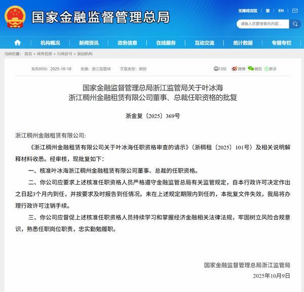 中国网财经10月10日讯今日,国家金融监督管理总局浙江监管局公布相关批复,核准叶冰海浙江稠州金融租赁有限公司(简称“稠州金租”)董事、总裁的任职资格。以下是相关批复正文: