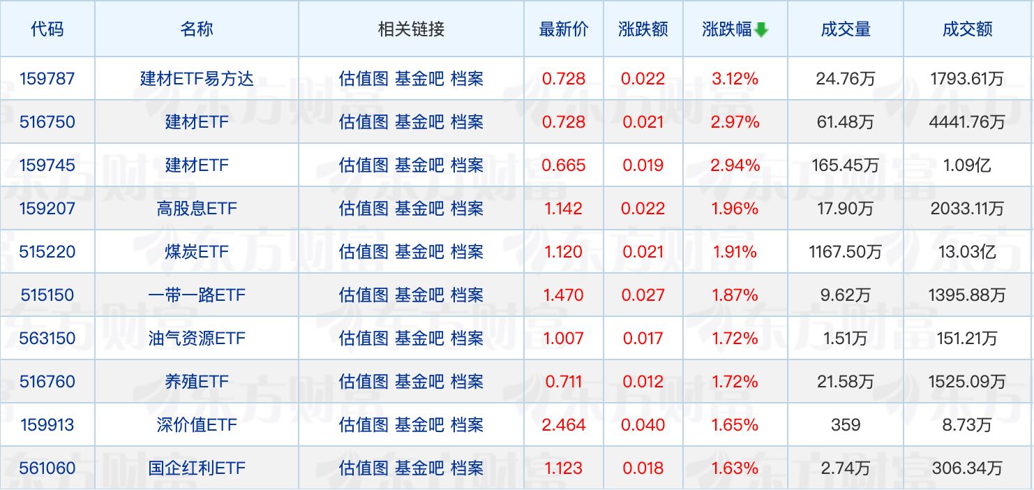 具体来看,建材相关ETF走强,最高涨3.12%。