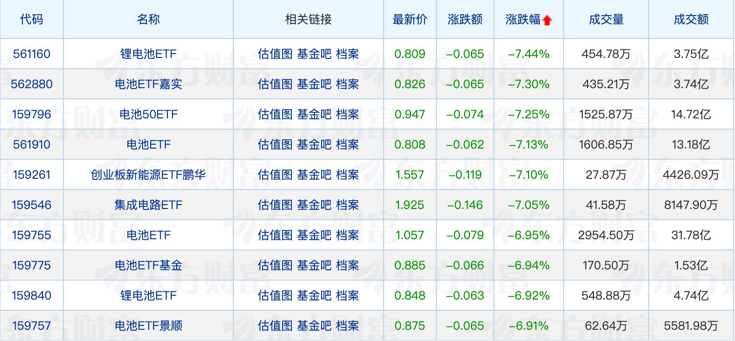 下跌方面,锂电池相关ETF全线回调,最高下跌7.44%。