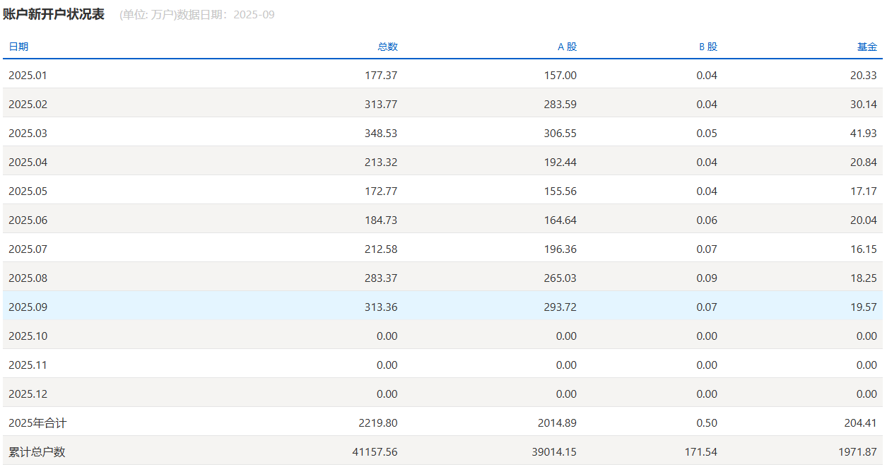 而从月度数据来看,2025年1月至8月,A股新开户总数分别为157万户、283.59万户、306.55万户、192.44万户、155.56万户、164.64万户、196.36万户、265.03万户。9月293.72万户的新开户数,仅次于3月的306.55万户。