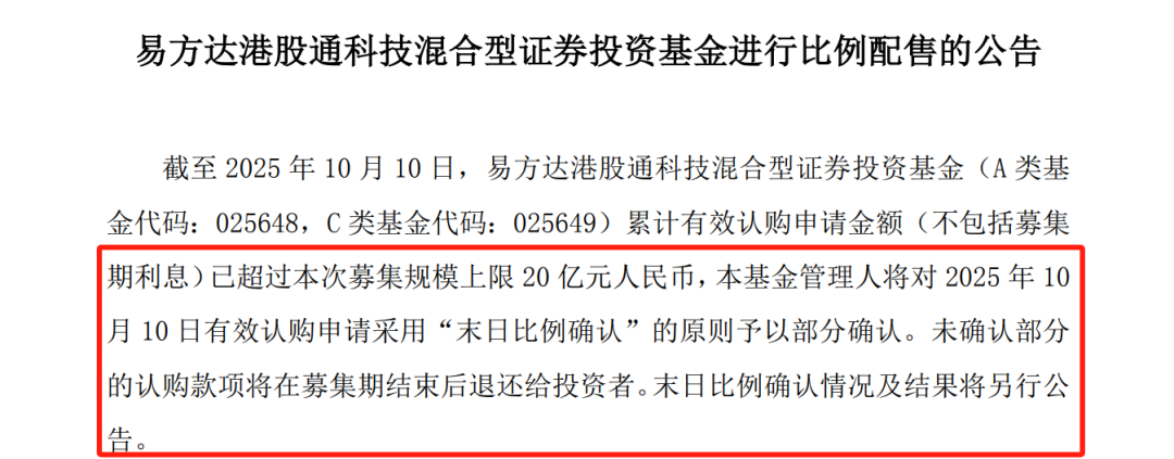 同时,易方达港股通科技混合基金还发布了比例配售公告。公告显示,截至10月10日,该基金累计有效认购申请金额(不包括募集期利息)已超过本次募集规模上限20亿元,易方达基金将对10月10日有效认购申请采用“末日比例确认”的原则予以部分确认。