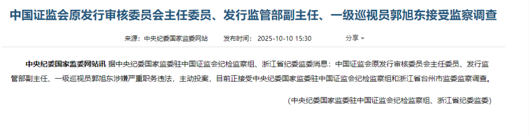 据中央纪委国家监委驻中国证监会纪检监察组、浙江省纪委监委消息,中国证监会原发行审核委员会主任委员、发行监管部副主任、一级巡视员郭旭东涉嫌严重职务违法,主动投案,目前正接受中央纪委国家监委驻中国证监会纪检监察组和浙江省台州市监委监察调查。