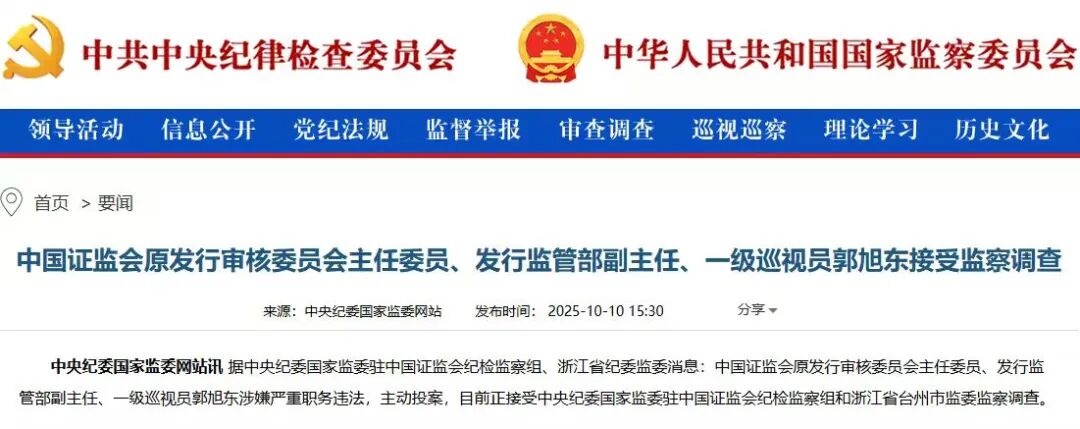据中央纪委国家监委驻中国证监会纪检监察组、浙江省纪委监委消息:中国证监会原发行审核委员会主任委员、发行监管部副主任、一级巡视员郭旭东涉嫌严重职务违法,主动投案,目前正接受中央纪委国家监委驻中国证监会纪检监察组和浙江省台州市监委监察调查。