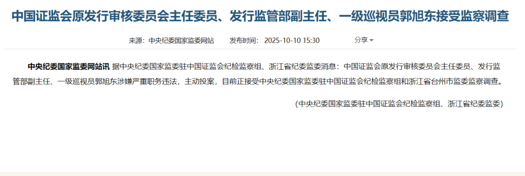 据中央纪委国家监委驻中国证监会纪检监察组、浙江省纪委监委消息:中国证监会原发行审核委员会主任委员、发行监管部副主任、一级巡视员郭旭东涉嫌严重职务违法,主动投案,目前正接受中央纪委国家监委驻中国证监会纪检监察组和浙江省台州市监委监察调查。