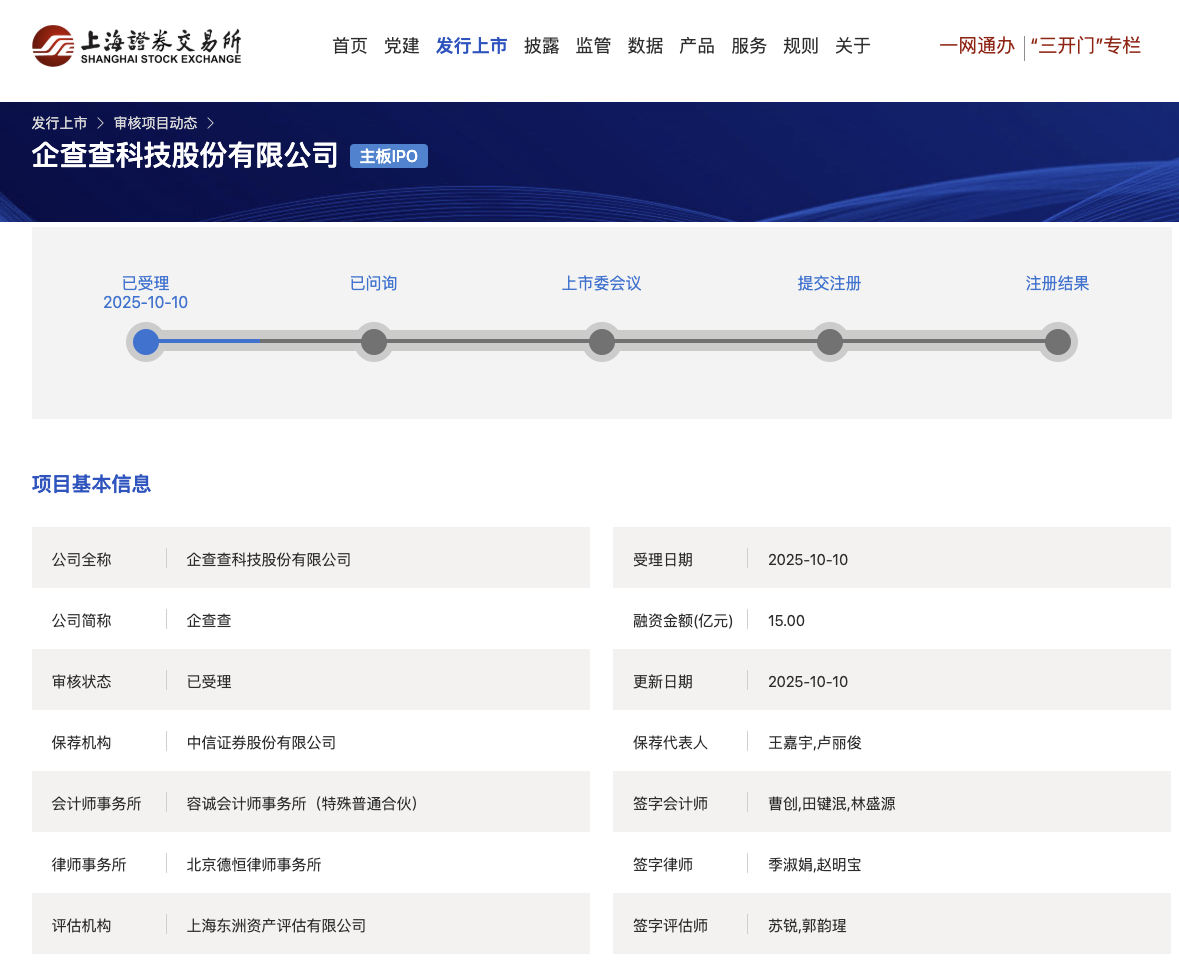 10月10日,上交所网站显示,企查查科技股份有限公司IPO申请获受理,拟登陆上交所主板。招股说明书申报稿披露,公司拟向社会公众公开发行不超过人民币普通股4025万股,占发行后公司总股本的10%。实际募集资金扣除发行费用后,拟将本次募集资金投入企查查商业大数据人工智能研发等多个项目。
