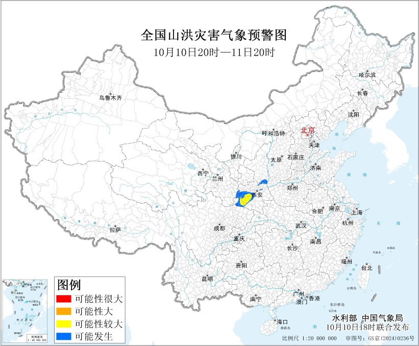 预计,10月10日20时至11日20时,四川东北部、陕西西南部和中部、甘肃东南部等地部分地区可能发生山洪灾害(蓝色预警),其中,陕西西南部局地发生山洪灾害可能性较大(黄色预警)。其他地区也可能因局地短历时强降水引发山洪灾害,请各地注意做好实时监测、防汛预警和转移避险等防范工作。