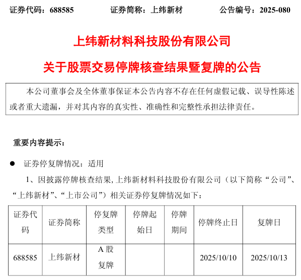 上纬新材(688585)10月10日晚间公告,公司股票将于10月13日(下周一)复牌。