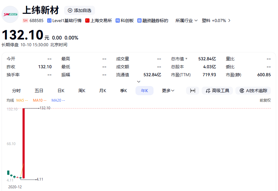 行情方面,上纬新材年内涨幅已经接近1900%,现报132.10元/股,总市值超500亿元。