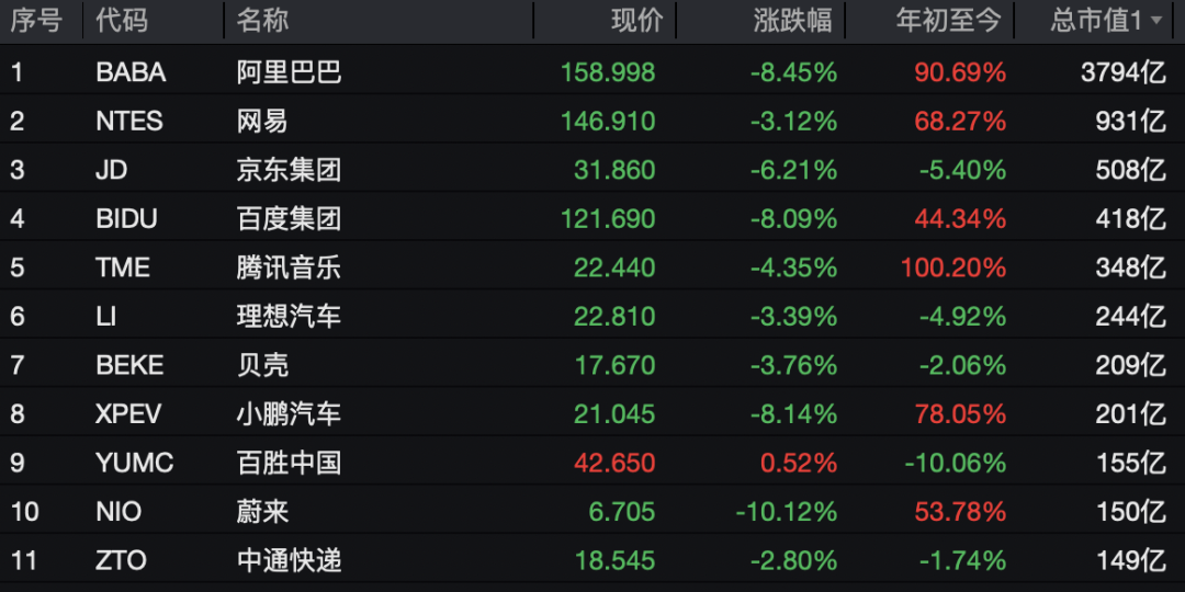 阿里巴巴跌8.45%,现报158.998美元/股;哔哩哔哩跌超9%,百度集团、小鹏汽车跌超8%,京东集团跌超6%,网易、理想汽车、贝壳等跌幅居前。