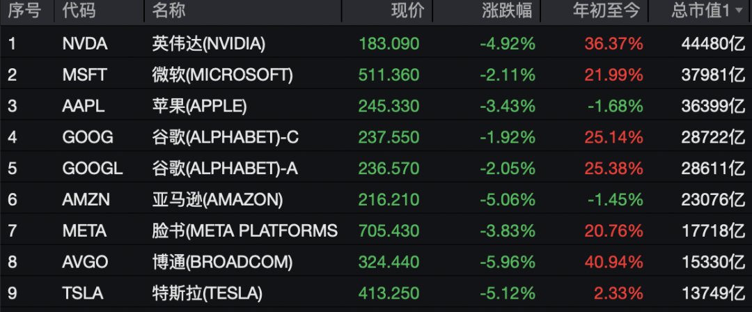 个股方面,亚马逊、特斯拉跌逾5%,英伟达跌近5%,苹果、脸书跌超3%,微软跌超2%,谷歌跌近2%。