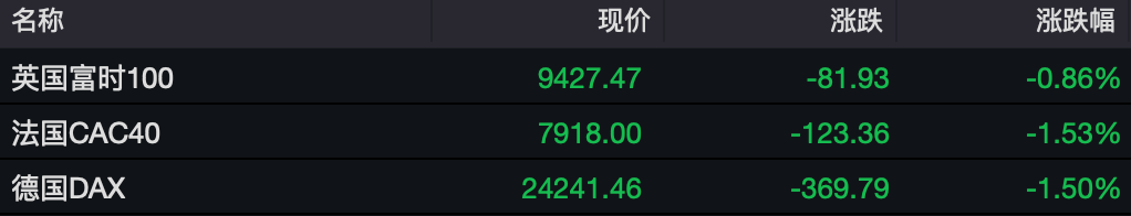 欧洲三大股指收盘也全线下跌,德国DAX指数跌1.5%,法国CAC40指数跌1.53%,英国富时100指数跌0.86%。本周,德国DAX指数跌0.56%,法国CAC40指数跌2.02%,英国富时100指数跌0.67%。