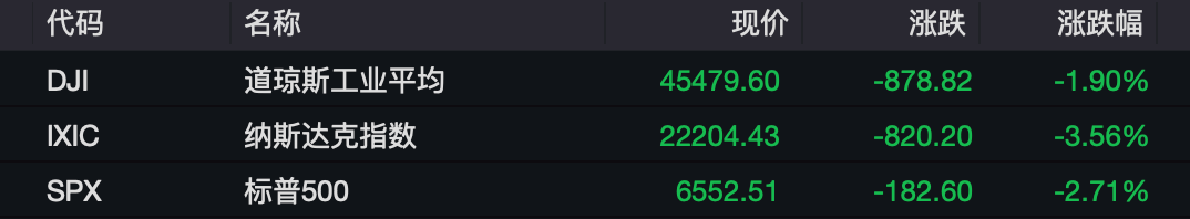 截至收盘,美国三大股指全线收跌,道琼斯工业指数跌1.9%报45479.6点,下跌近900点,标普500指数跌2.71%报6552.51点,纳斯达克指数跌3.56%报22204.43点。本周,道琼斯工业指数跌2.73%,标普500指数跌2.43%,纳斯达克指数跌2.53%。