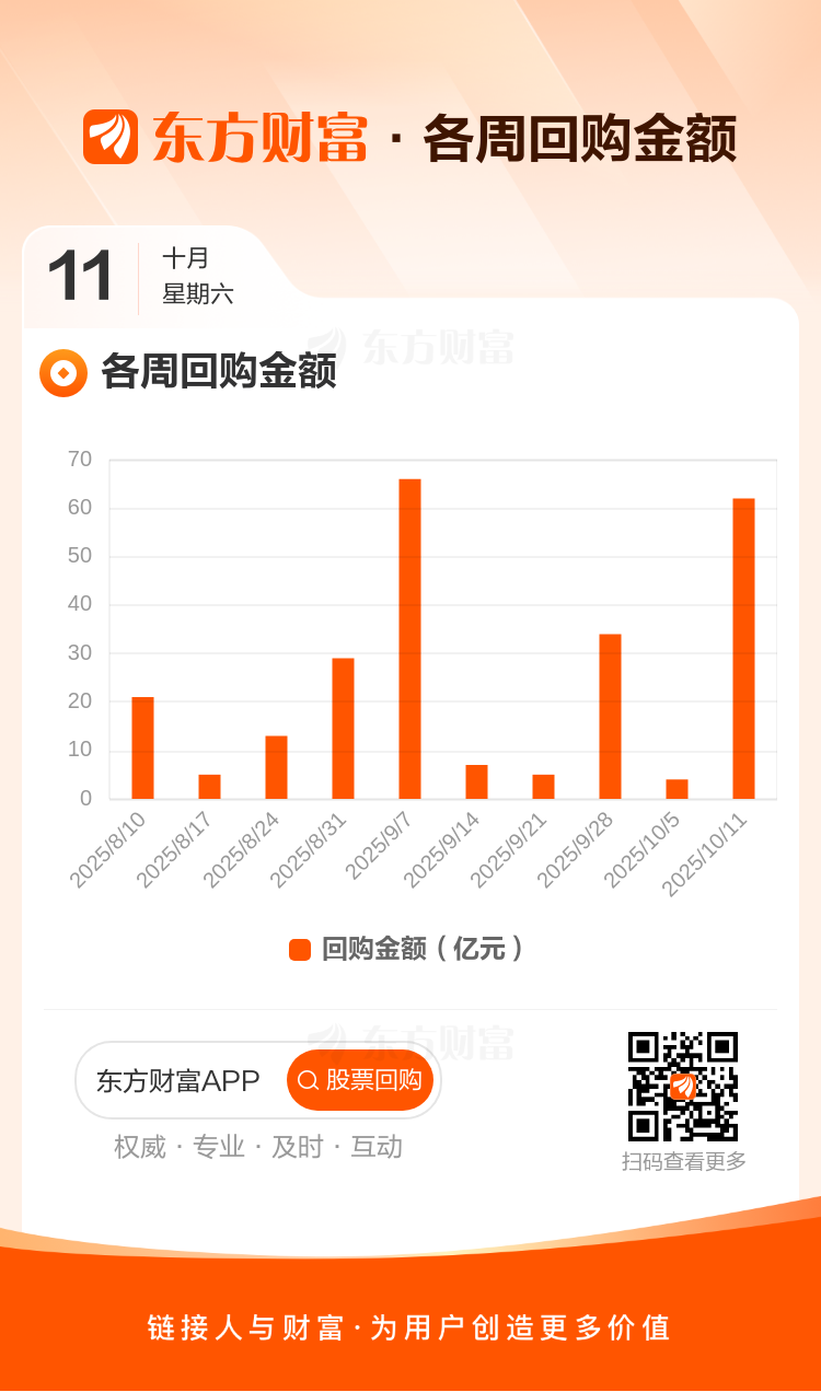 东方财富Choice数据显示,截至10月11日,本周有20家A股公司披露回购实施情况,合计回购金额62.47亿元,高于上周的4.08亿元。
