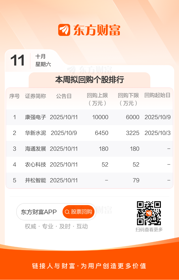 本周有5家公司宣布回购计划,按拟回购金额上限统计,计划回购金额1.67亿元。其中康强电子拟回购金额上限最高,为1.00亿元。
