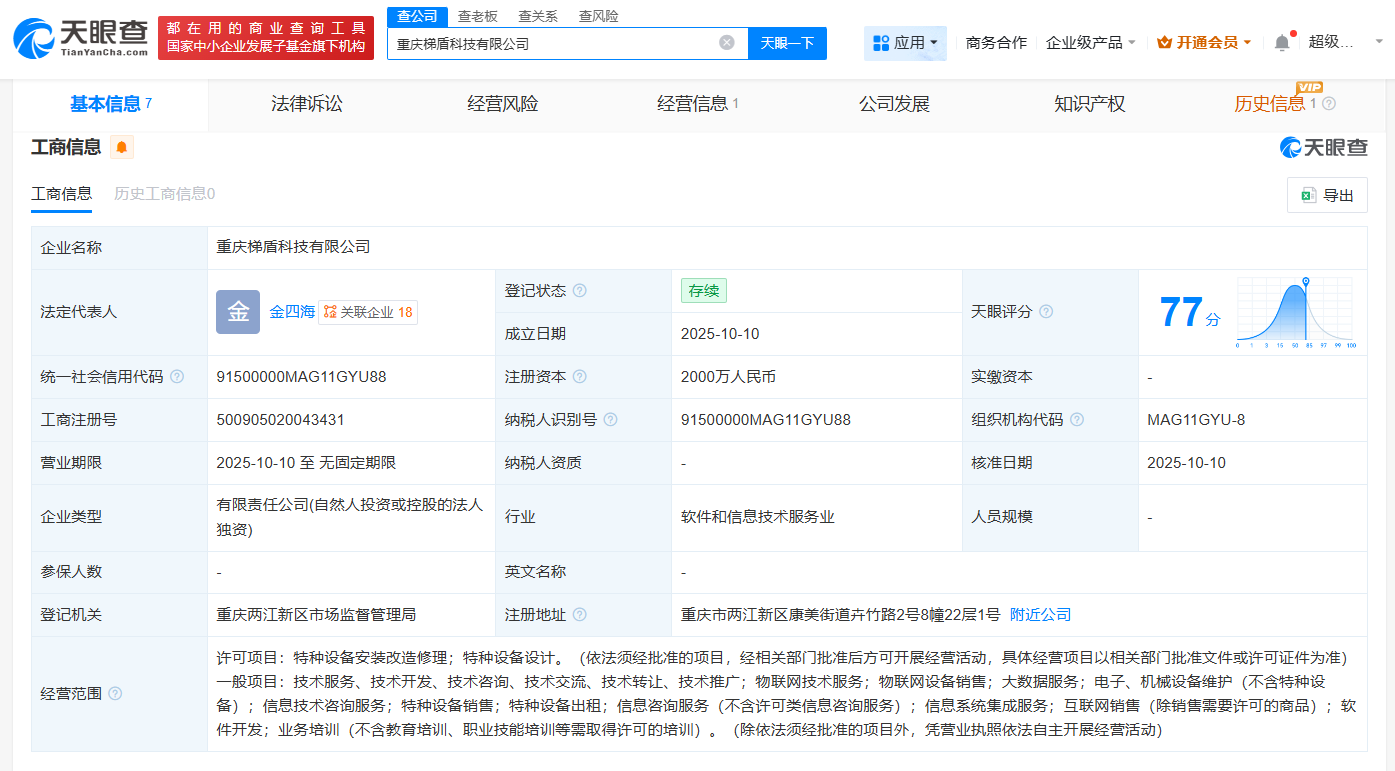 每经AI快讯,天眼查App显示,近日,重庆梯盾科技有限公司成立,法定代表人为金四海,注册资本2000万元人民币,经营范围包括特种设备安装改造修理、特种设备设计、大数据服务、特种设备出租等。股东信息显示,该公司由重庆啄木鸟网络科技有限公司全资持股。