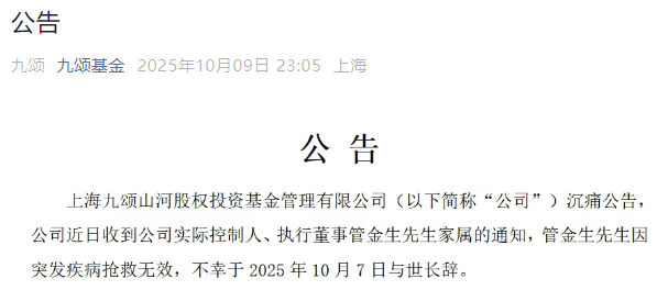 根据九颂基金10月9日晚公告,公司于近日收到公司实际控制人、执行董事管金生家属的通知,管金生因突发疾病抢救无效,不幸于2025年10月7日与世长辞。