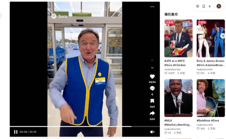 (网友用Sora生成的视频中,罗宾假扮为沃尔玛营业员;该视频旁推荐了更多深度伪造的娱乐视频)