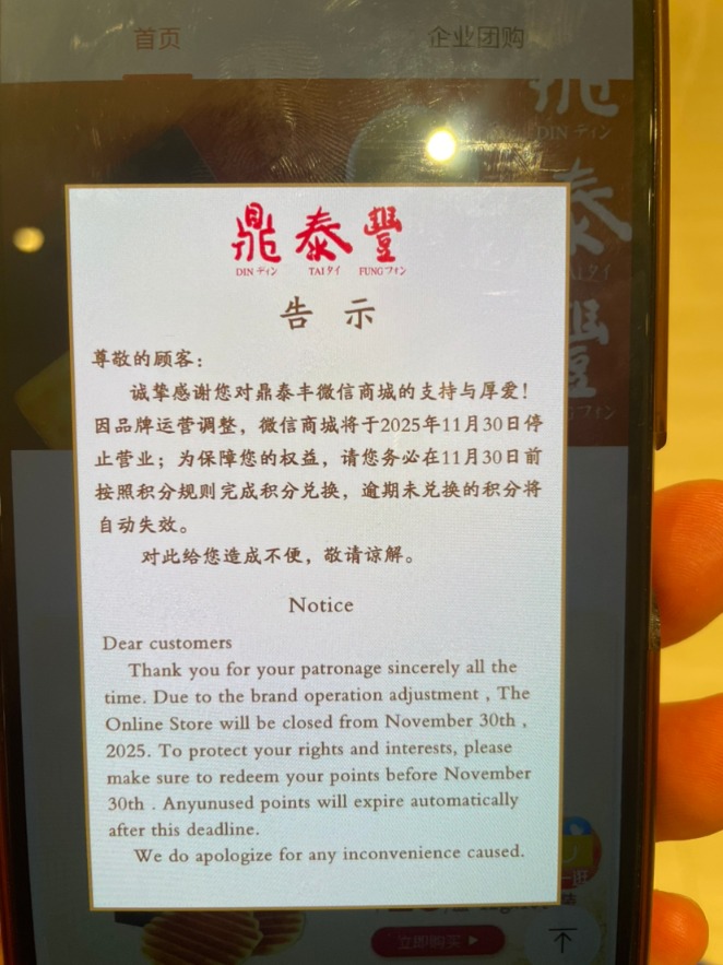 10月10日,鼎泰丰突发消息称,因品牌运营调整,鼎泰丰微信商城将于2025年11月30日停止营业。顾客务必在11月30日前按照积分规则完成积分兑换,逾期未兑换的积分将自动失效。