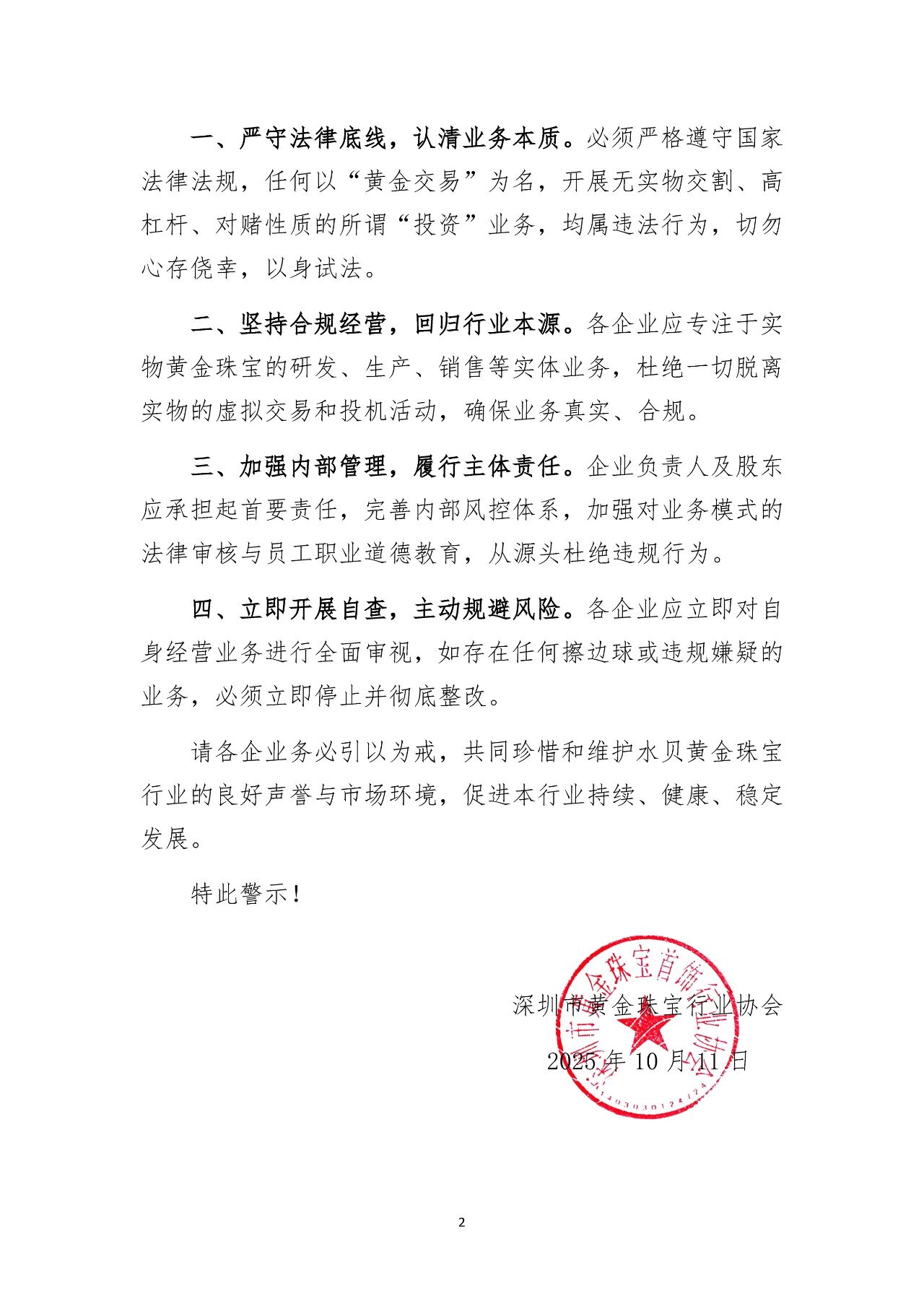 同时,为维护行业健康秩序,防范法律风险,深圳市黄金珠宝行业协会特向全体会员单位及行业企业发出郑重警示: