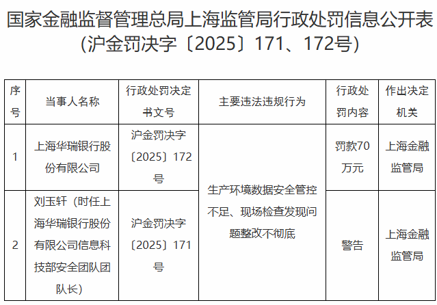根据国家金融监督管理总局上海监管局于10月11日公布的行政处罚信息,上海华瑞银行股份有限公司因生产环境数据安全管控不足、现场检查发现问题整改不彻底被处以70万元罚款。