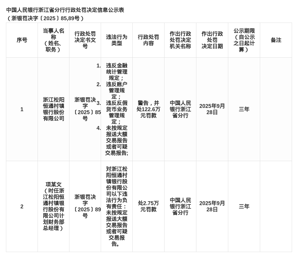 浙江松阳恒通村镇银行被罚122.6万,涉违反金融统计管理规定等