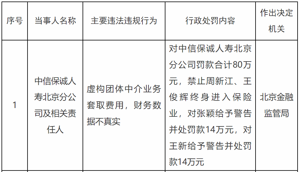 10月11日,国家金融监督管理总局北京监管局发布的行政处罚信息显示,因虚构团体中介业务套取费用,财务数据不真实,中信保诚人寿北京分公司被罚款合计80万元,相关责任人周新江、王俊辉被禁止终身进入保险业,张颖被给予警告并处罚款14万元,王新被给予警告并处罚款14万元。