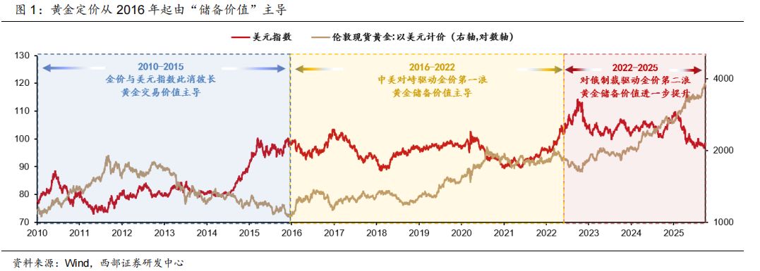 西部证券研报提及,2016年以来,黄金定价从“交易价值”主导切换到“储备价值”主导,随着美元信用裂痕持续扩张,金价将开启长期牛市。