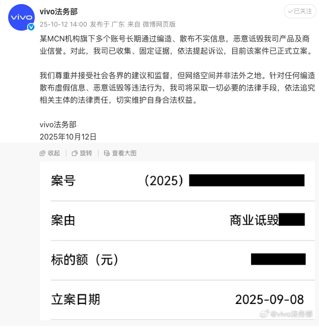 10月12日,vivo法务部发文表示,某MCN机构旗下多个账号长期通过编造、散布不实信息,恶意诋毁公司产品及商业信誉。对此,公司已收集、固定证据,依法提起诉讼,目前该案件已正式立案。
