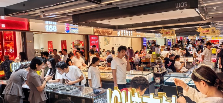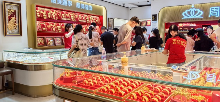 记者在水贝多个黄金珠宝商场看到,主打婚庆类产品的店铺人气最旺。