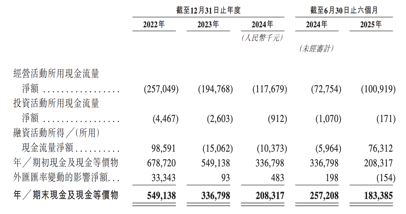 公司于2022年、2023年、2024年及截至2025年6月30日止六个月产生的经营现金净流出分别为2.57亿元、1.95亿元、1.18亿元及1.01亿元,主要是由于公司就提供解决方案、进行研发以及销售及营销活动以及行政管理产生大量经营开支,从而产生除税前亏损。