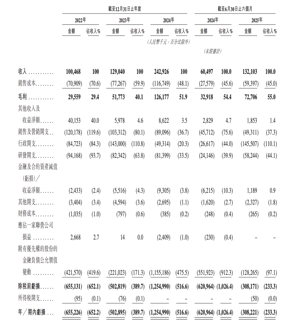 根据招股书,2022年~2024年,滴普科技营收分别为1亿元、1.29亿元、2.43亿元;毛利分别为2956万元、5177万元、1.26亿元;毛利率分别为29.4%、40.1%、51.9%。公司年内亏损分别为6.55亿元、5亿元、12.55亿元;年内亏损率分别为652.2%、389.7%、516.6%。