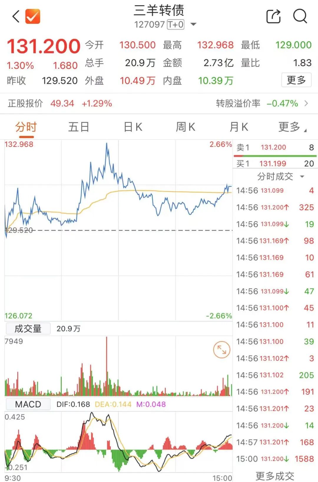 截至10月10日收盘,三羊转债收盘价为131.20元/张。对照强赎价格,投资者若是未及时操作,或将亏损超23%。截至目前,三羊转债仍有1.24亿元余额尚未完成交易或转股,所占比例接近60%。