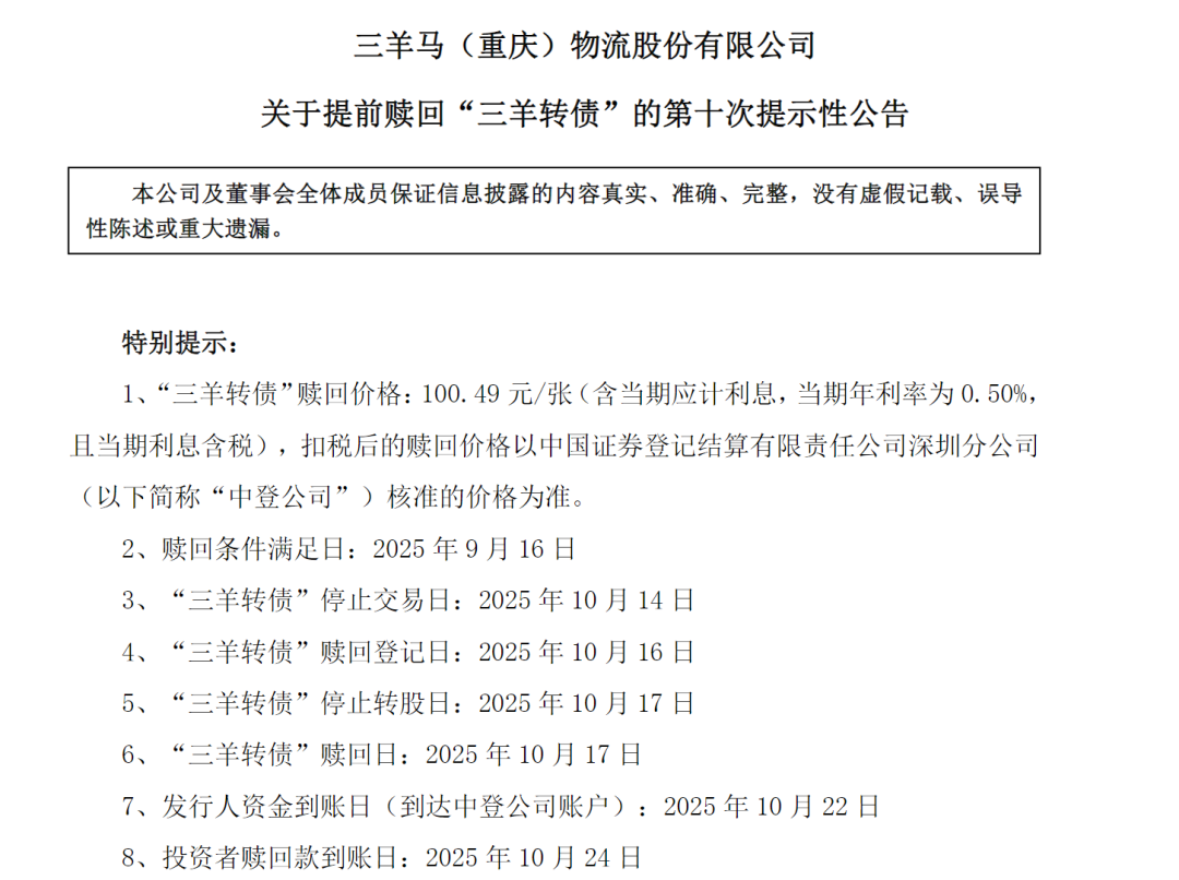 10月10日,三羊马发布关于提前赎回“三羊转债”的第十次提示性公告,提醒投资者10月13日为三羊转债最后一个交易日,10月16日是最后一个转股日,债券持有人应及时卖出或转股。10月16日收市后,未实施转股的三羊转债将全部冻结,停止交易和转股。