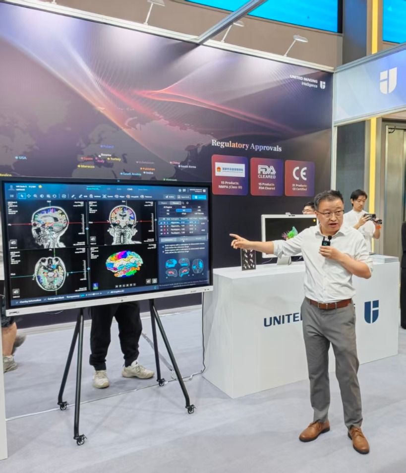 联影智能联席CEO周翔现场为参观的跨国企业介绍AI+医疗