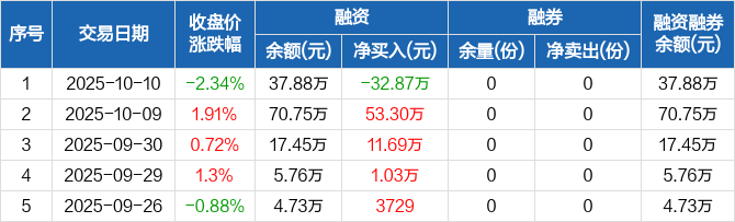 融资方面,当日融资买入126.5万元,融资偿还159.37万元,融资净偿还32.87万元。融券方面,融券卖出0份,融券偿还0份,融券余量0份,融券余额0元。融资融券余额合计37.88万元。